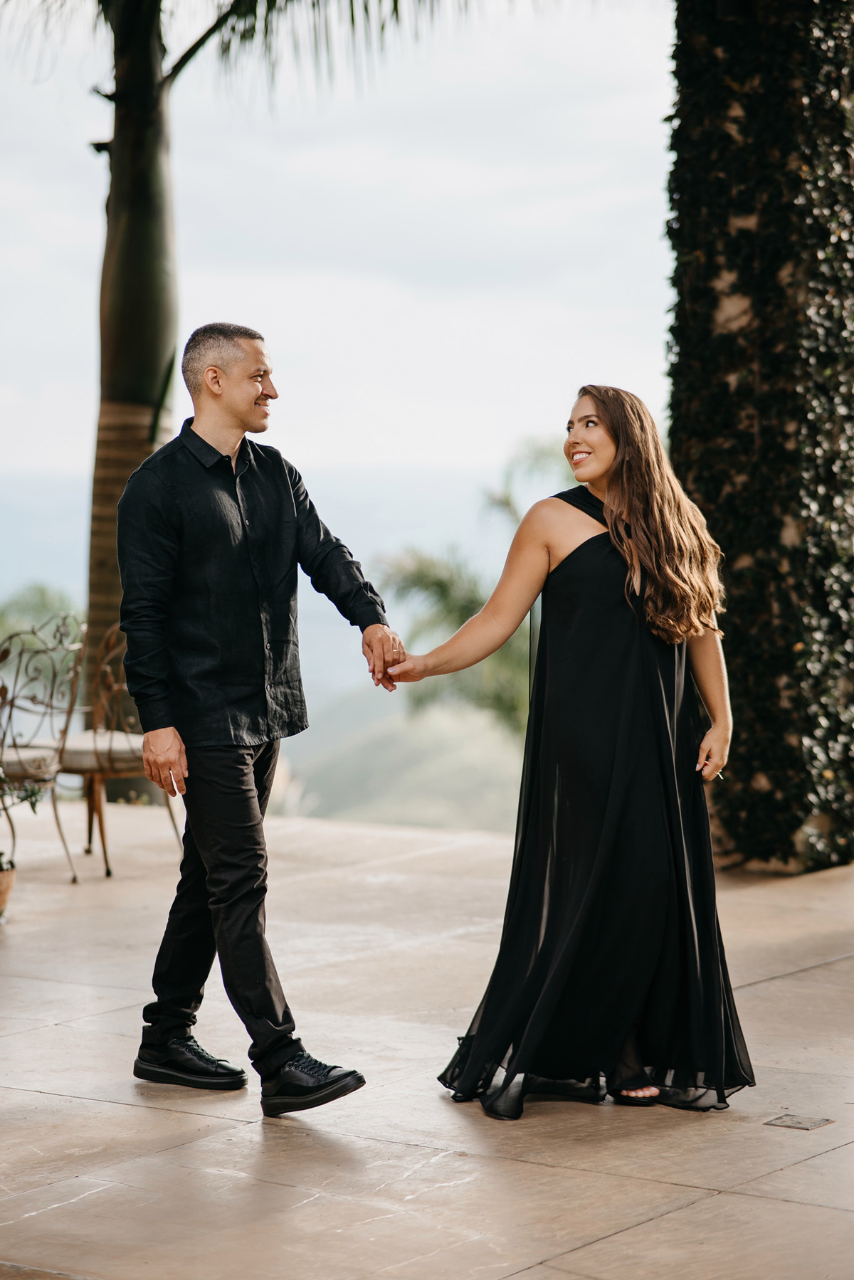O encontro começou com a promessa da chuva, mas o que caiu sobre nós foi a leveza. No mirante, vestidos de branco, eles trouxeram o sol para dentro da conversa. Não era preciso pedir sorrisos; eles transbordavam de forma orgânica, genuína, como se o mundo ao redor fosse apenas um espectador da alegria que eles cultivam entre si.