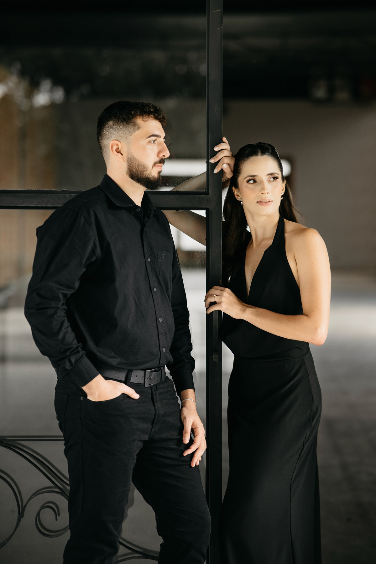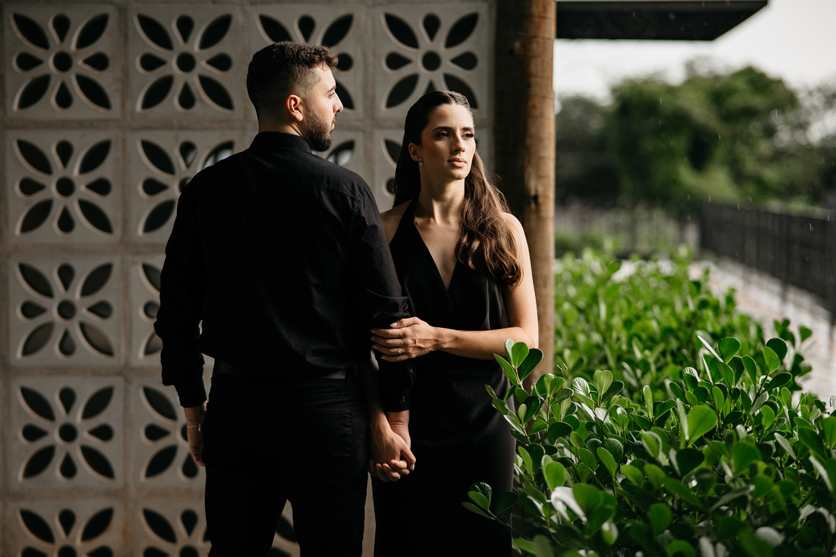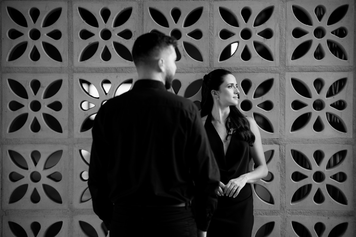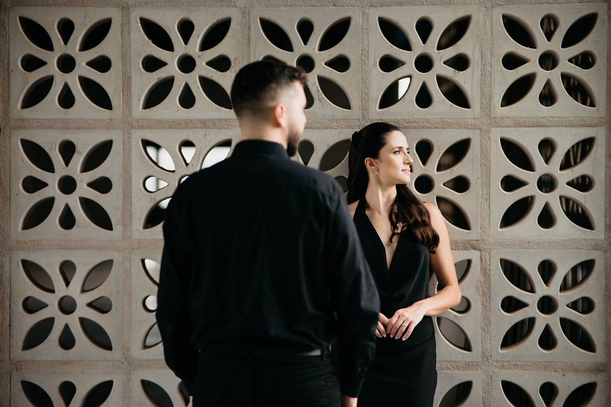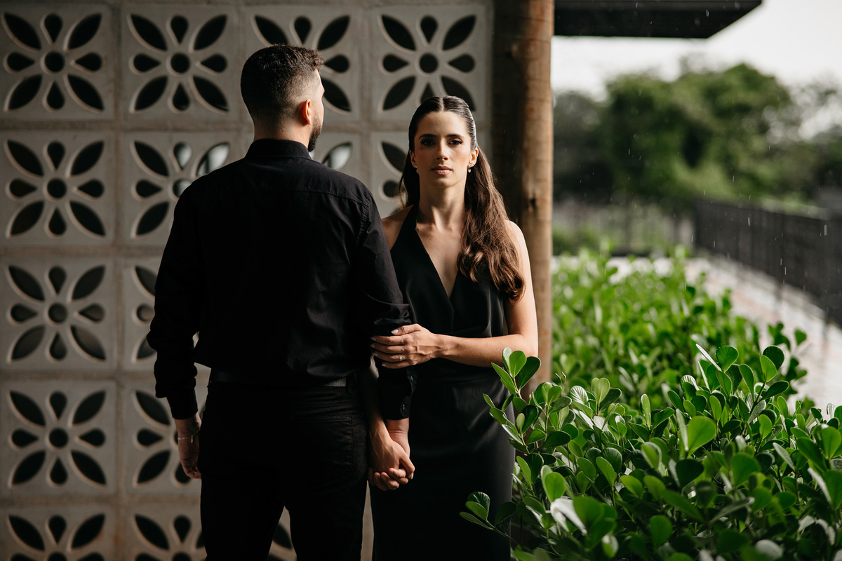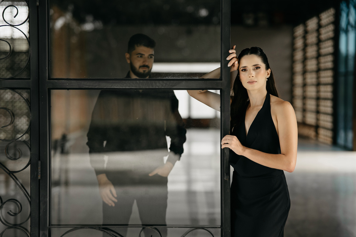 Começamos com a força e o mistério do preto, explorando uma elegância que pareceu brotar naturalmente da conexão deles. Mesmo entre os vãos e detalhes da Galeria, o que preenchia o espaço era a vibração de um casal que sorri com facilidade, transformando qualquer timidez diante da lente em poesia visual.