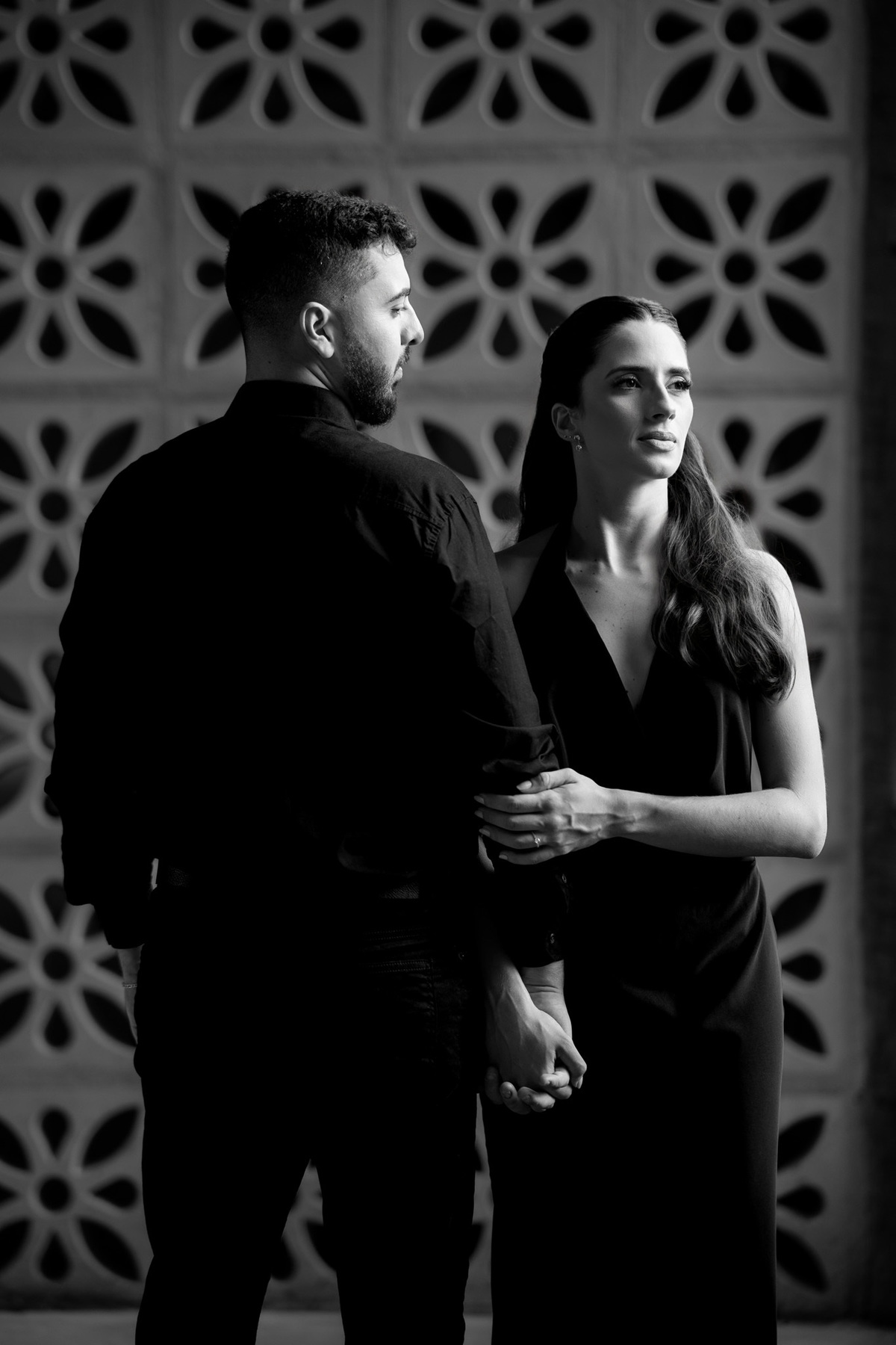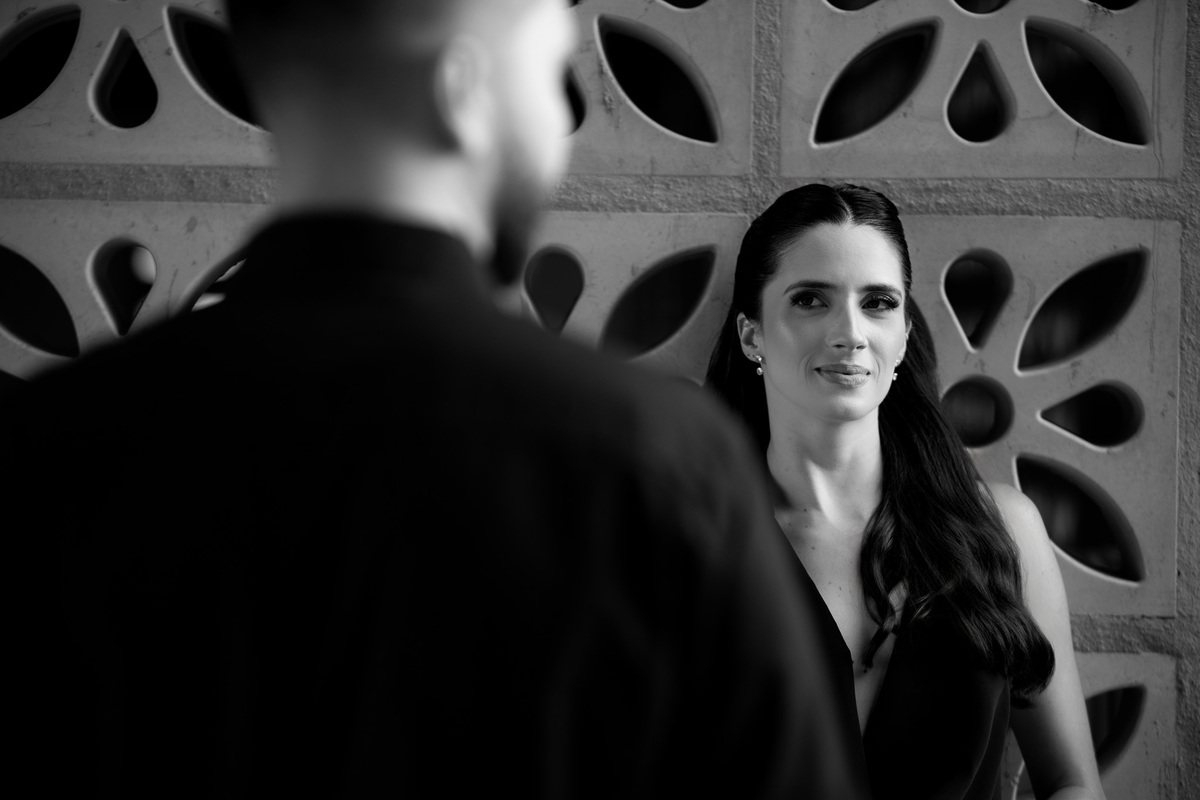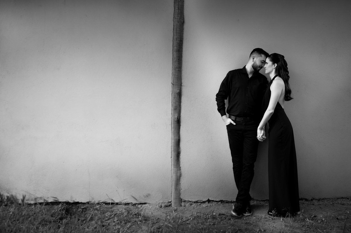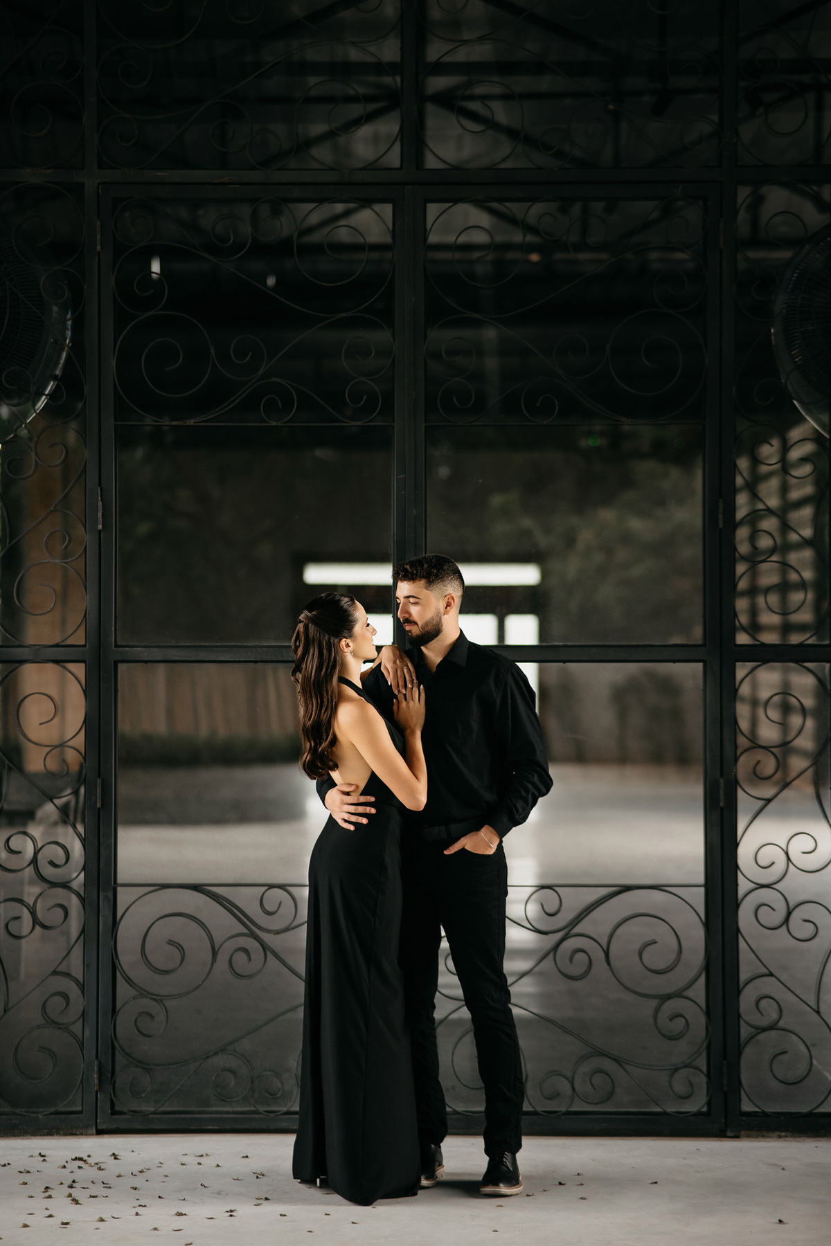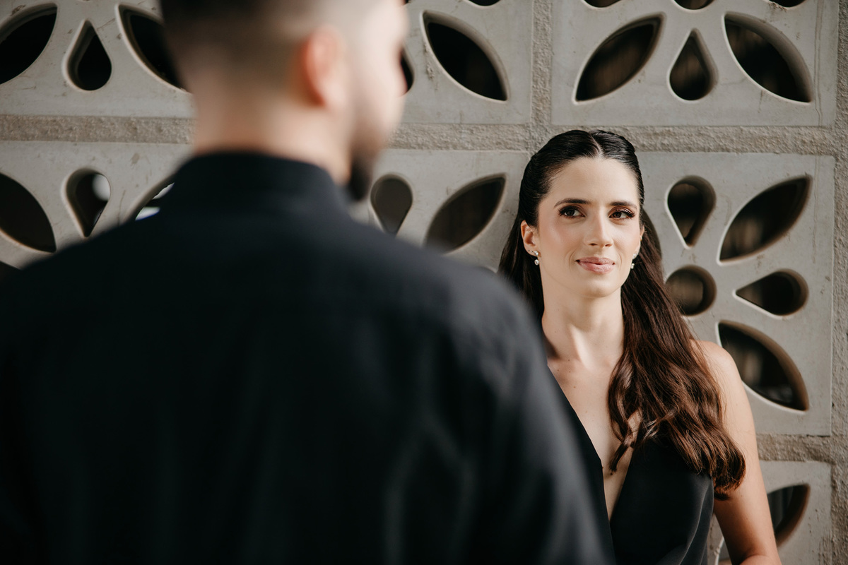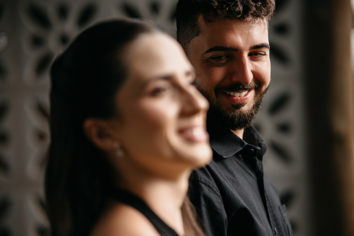 Começamos com a força e o mistério do preto, explorando uma elegância que pareceu brotar naturalmente da conexão deles. Mesmo entre os vãos e detalhes da Galeria, o que preenchia o espaço era a vibração de um casal que sorri com facilidade, transformando qualquer timidez diante da lente em poesia visual.