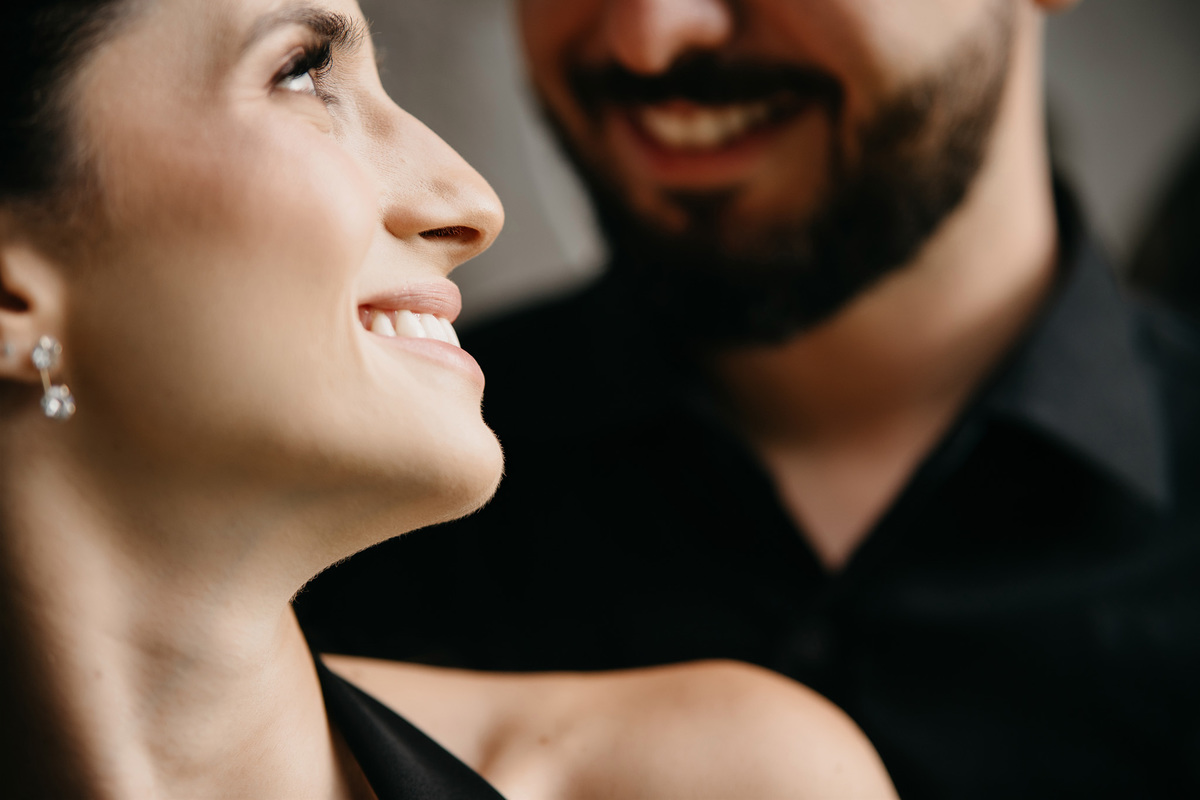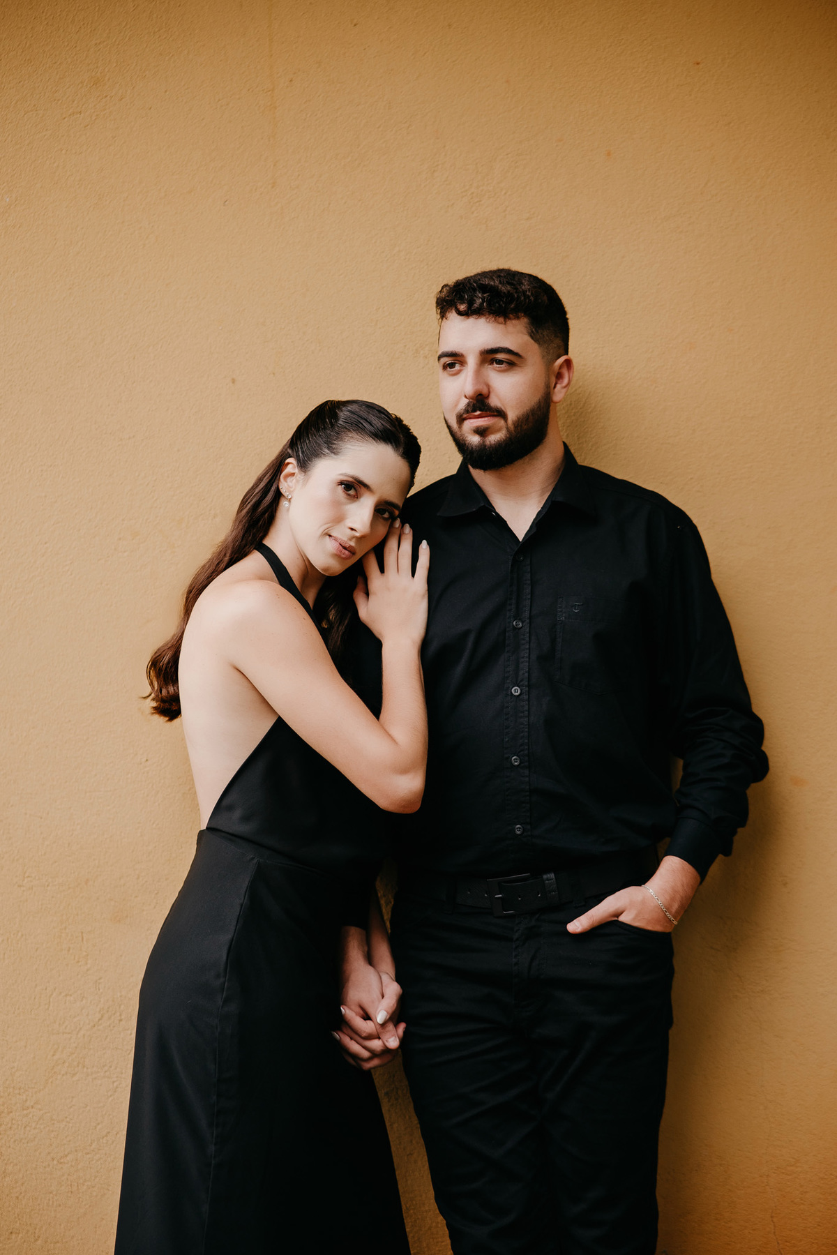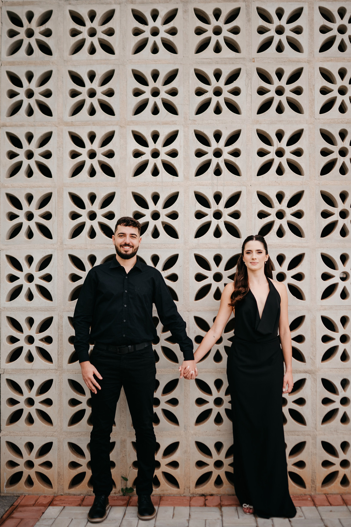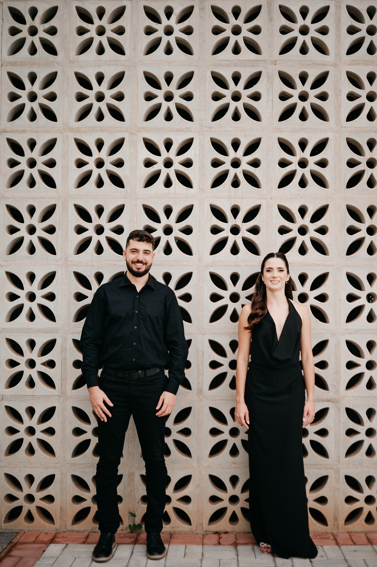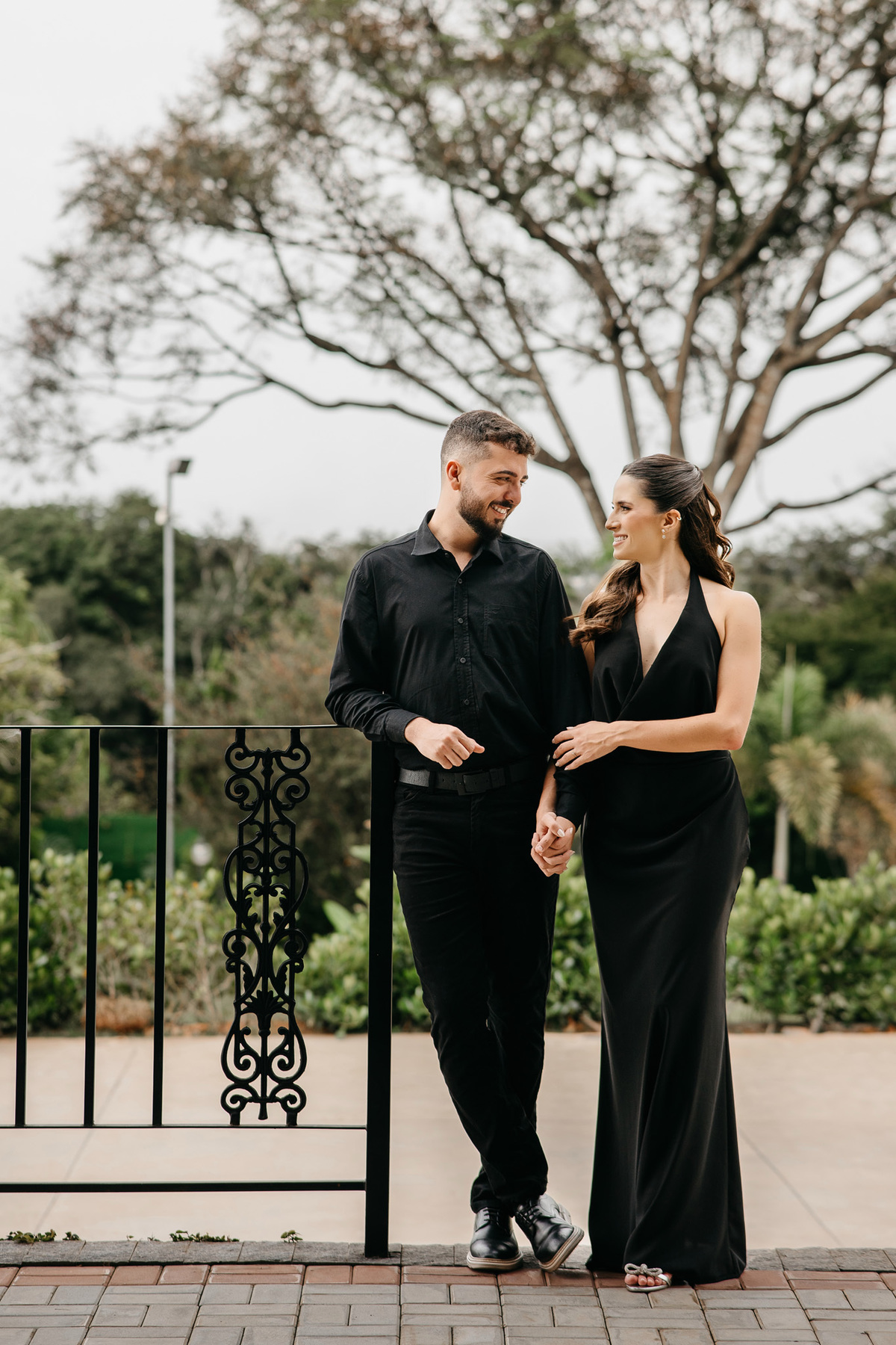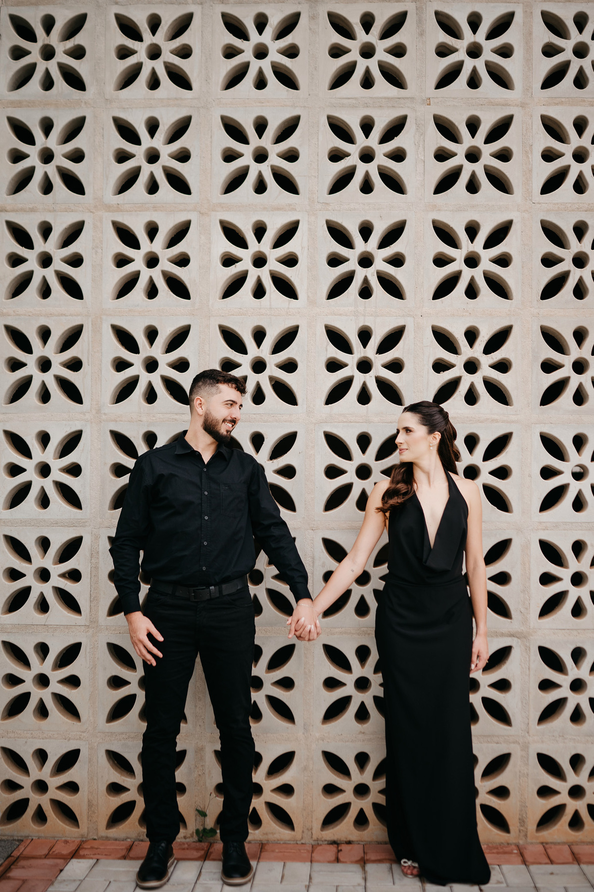 Começamos com a força e o mistério do preto, explorando uma elegância que pareceu brotar naturalmente da conexão deles. Mesmo entre os vãos e detalhes da Galeria, o que preenchia o espaço era a vibração de um casal que sorri com facilidade, transformando qualquer timidez diante da lente em poesia visual.