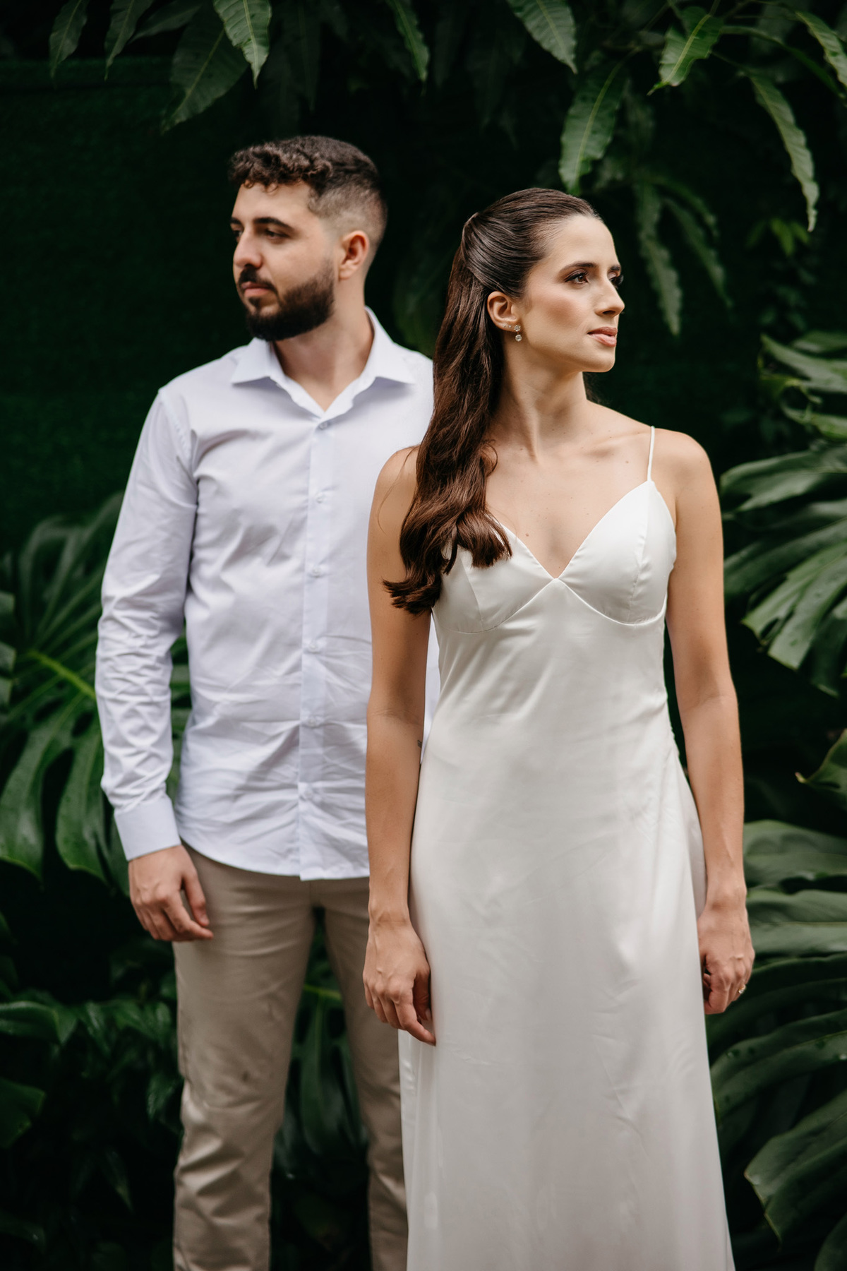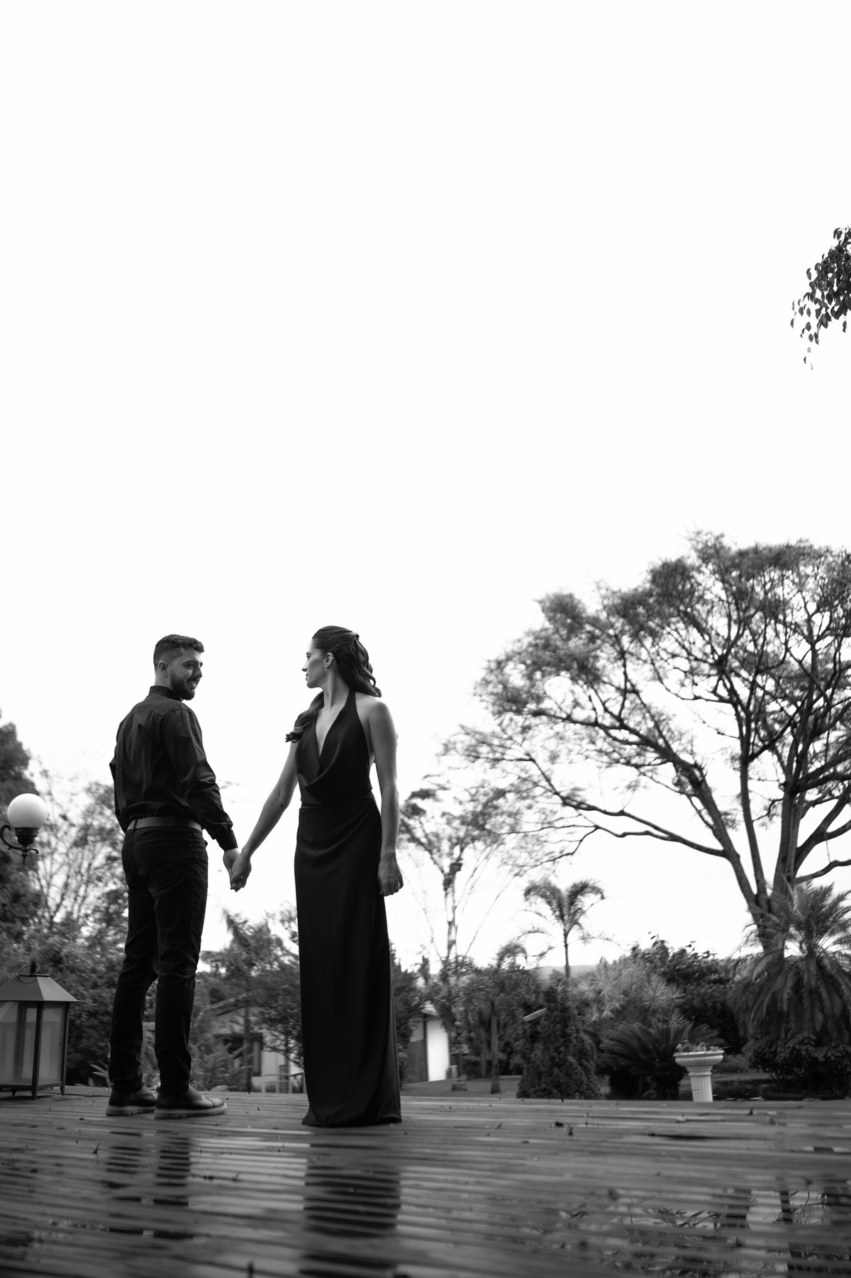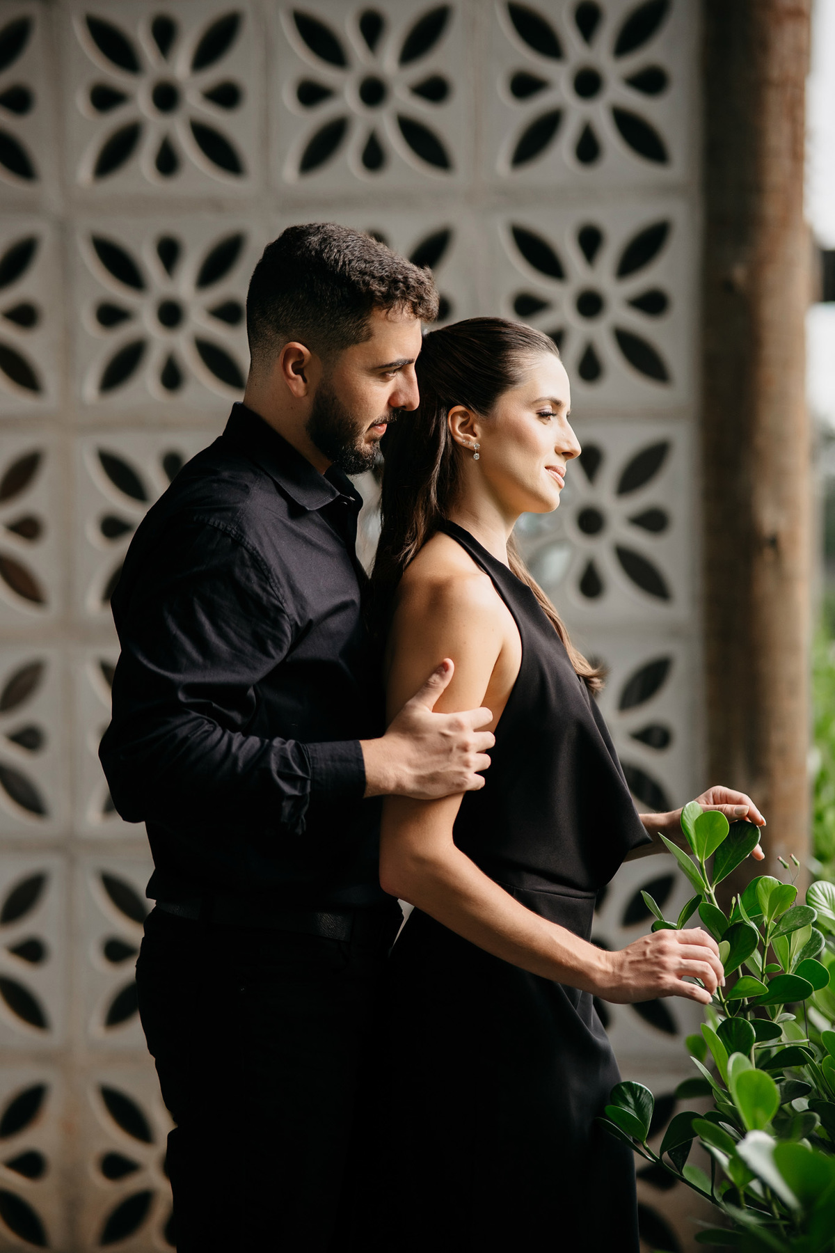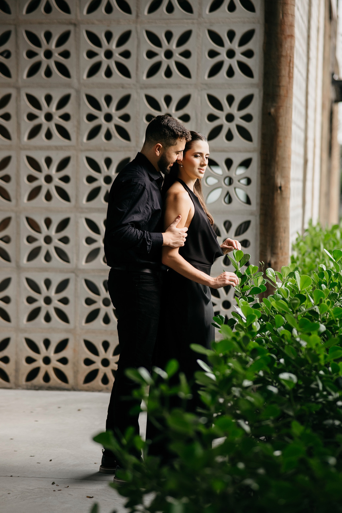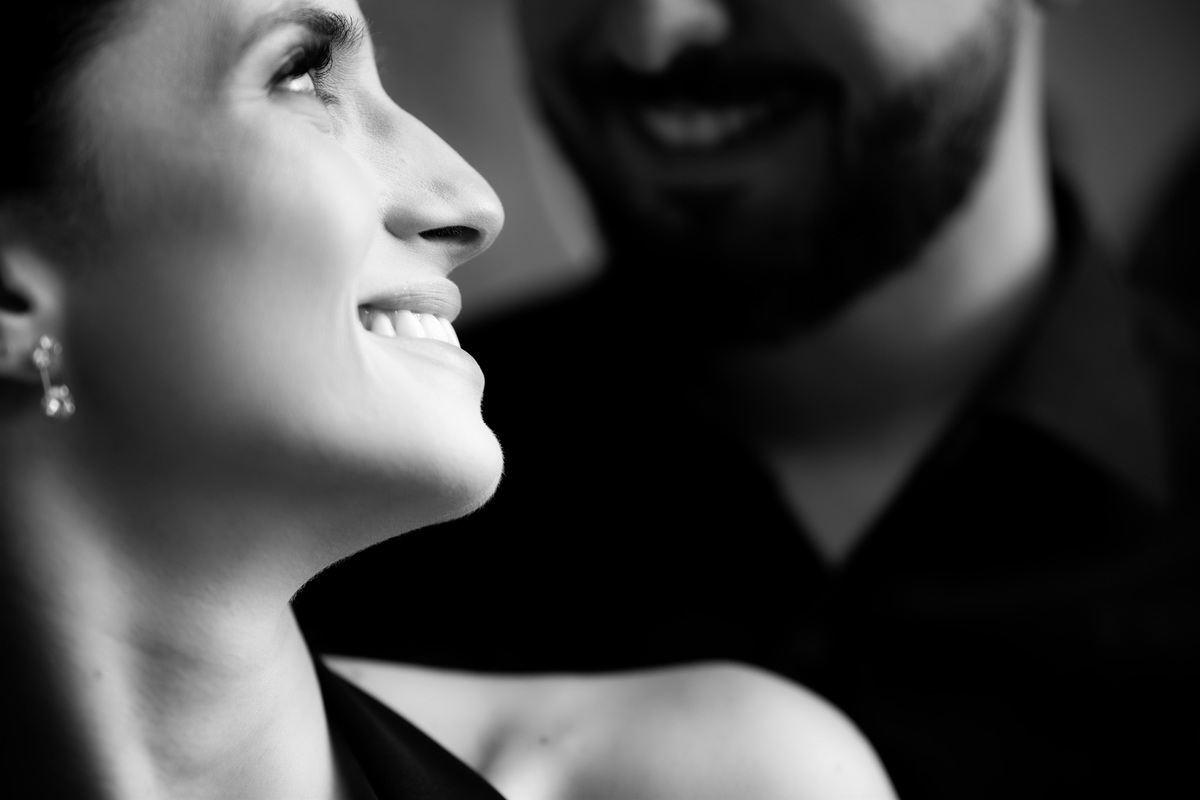 Começamos com a força e o mistério do preto, explorando uma elegância que pareceu brotar naturalmente da conexão deles. Mesmo entre os vãos e detalhes da Galeria, o que preenchia o espaço era a vibração de um casal que sorri com facilidade, transformando qualquer timidez diante da lente em poesia visual.