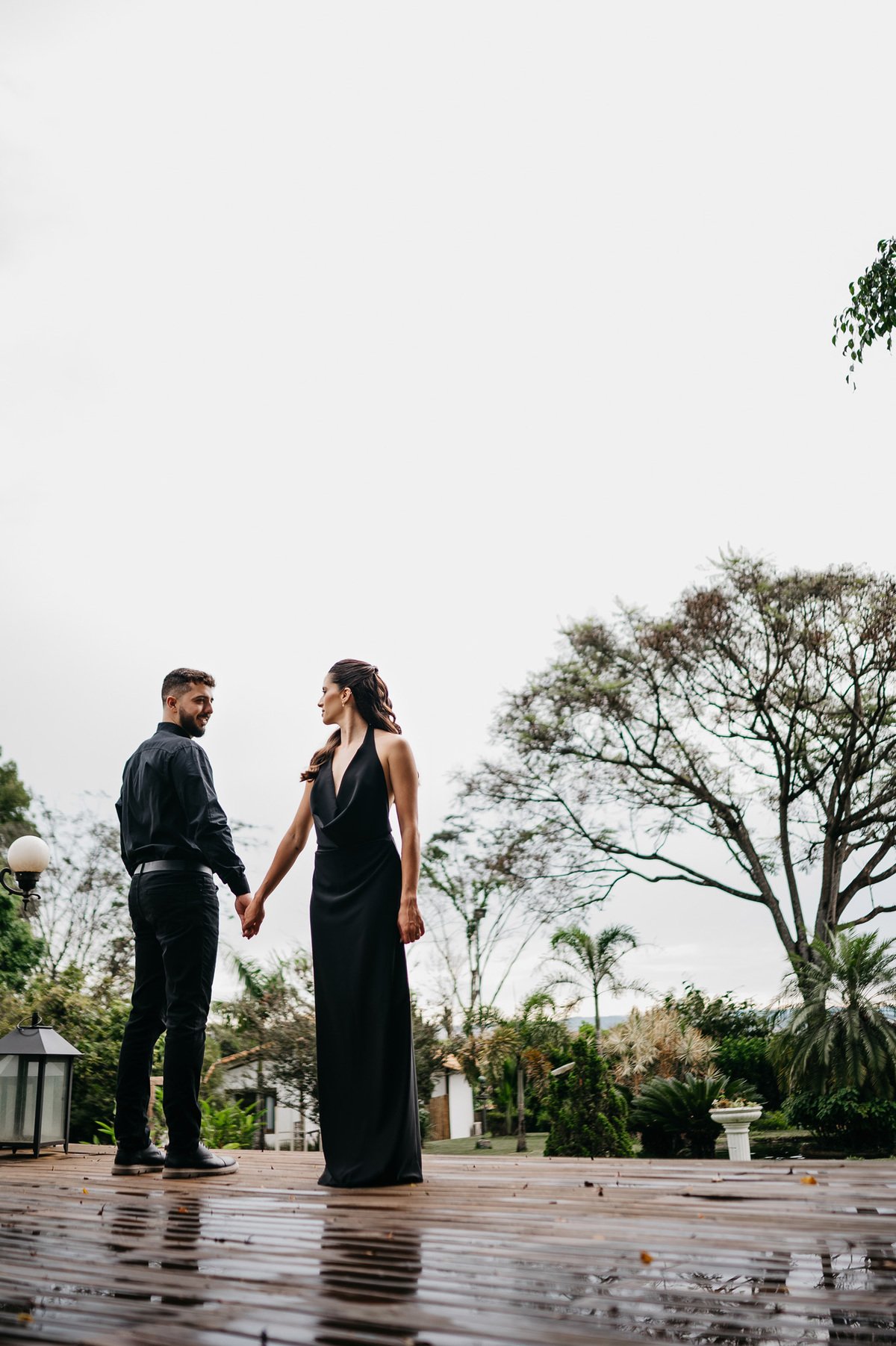 O plano era o céu aberto, mas a chuva chegou sem pedir licença. O que poderia ser um contratempo tornou-se o convite perfeito para o aconchego. Protegidos pelo salão, o ambiente ganhou uma atmosfera moderna e ao mesmo tempo profundamente intimista.